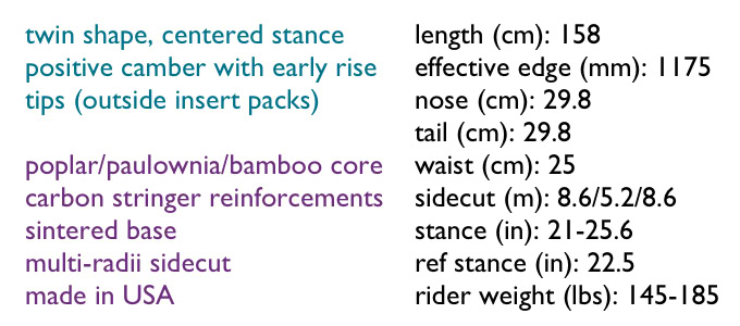 Built for all snow conditions - it’s a daily-driver board with a classic freestyle feel. Very quick and maneuverable with dependably even flex and stability. Rides all day, in whatever style and snow-depth you want.